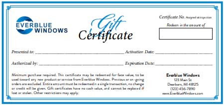 Minimum purchase required. This certificate may be redeemed for face value, to be used toward any new product or service from Blue Ocean . Previous or on-going orders are excluded. Entire amount must be redeemed in a single transaction, no change or credit will be given. Gift certificates have no cash value, and cannot be replaced if lost or stolen. Other restrictions may apply